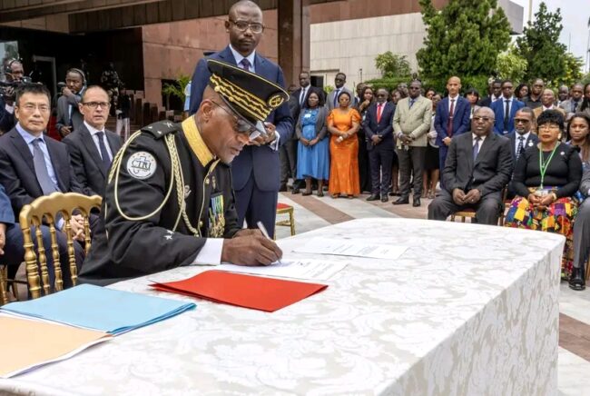 En présence des membres du Comité pour la transition et la restauration des institutions (CTRI), du gouvernement de la transition, des présidents des corps constitués, des partenaires internationaux de la filière forêt-bois. Cette cérémonie solennelle a été ponctuée par, non seulement la signature du protocole d’accord relatif à ladite session, mais également à sa remise symbolique dans les mains du numéro un Gabonais.