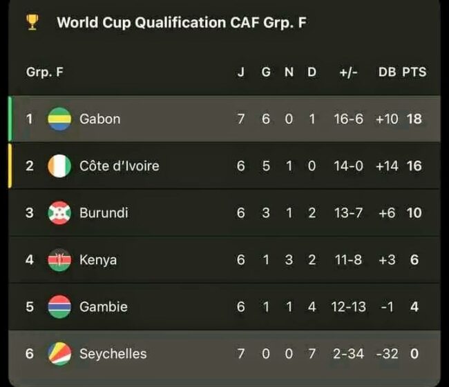 Un classement qui pourrait changer au terme du match qui va opposer la Côte d’Ivoire au Burundi, le 5 septembre 2025 à Abidjan. Un résultat positif du Gabon en déplacement, qui va requinquer le moral des protégés du sélectionneur national Thierry Mouyouma, avant de recevoir la Côte d’Ivoire dans explication décisive, le 9 septembre prochain au stade de Franceville.