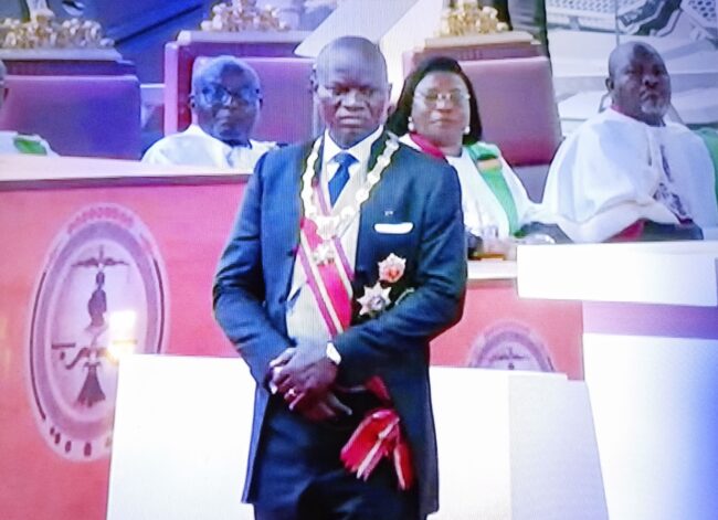 S’en est suivi l’entrée officielle dans le stade, le drapeau national : Vert-Jaune-Bleu, et l’audience solennelle de prestation de serment et d’investiture du président élu. Cette audience était dirigée par le président de la Cour constitutionnelle de la Transition, Dieudonné Aba’a Owono.