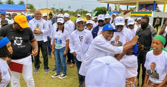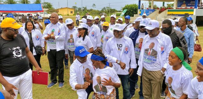 Avec à sa tête Sosthène Nguema Nguema, cette équipe de campagne a animé, tour à tour, des meetings au village Edoum (canton Mbè) et à la place des fêtes de Medouneu, chef-lieu du département du Haut-Como. Dans l’après-midi, ce « Team » au « Bâtisseur en chef » a fait un halte à Sam, chef-lieu du district éponyme, dans le département de l’Okano.
