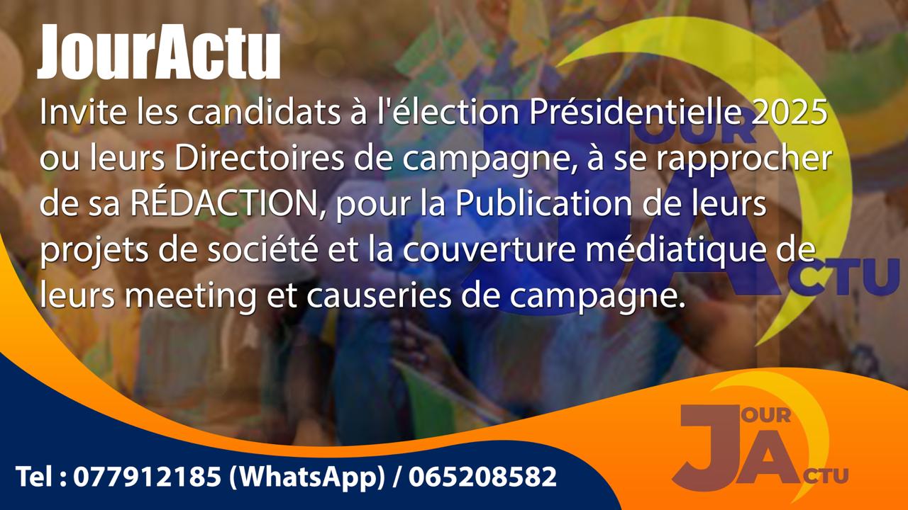 Le média en ligne, JOURACTU, ouvre sa page aux différents candidats à l’élection présidentielle du 12 avril 2025, pour la publication, « En temps réel », de leurs Projets de société, ainsi que pour la couverture médiatique de leurs causeries et meetings de campagne à Libreville, Ntoum (Estuaire), Port-Gentil (Ogooué-Maritime), Lambaréné (Moyen-Ogooué), Oyem, Bitam, Mitzic, Medouneu et Minvoul (Woleu-Ntem).